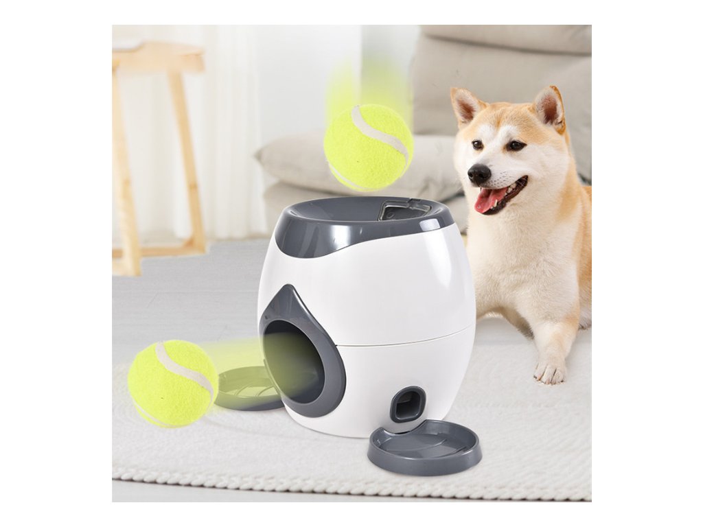 Aruncătorul interactiv de mingi combină jocul clasic de a aduce mingea cu distribuirea recompenselor . Când câinele returnează mingea, un mecanism automat eliberează o mică doză de recompense, motivându-l să o folosească în mod regulat.