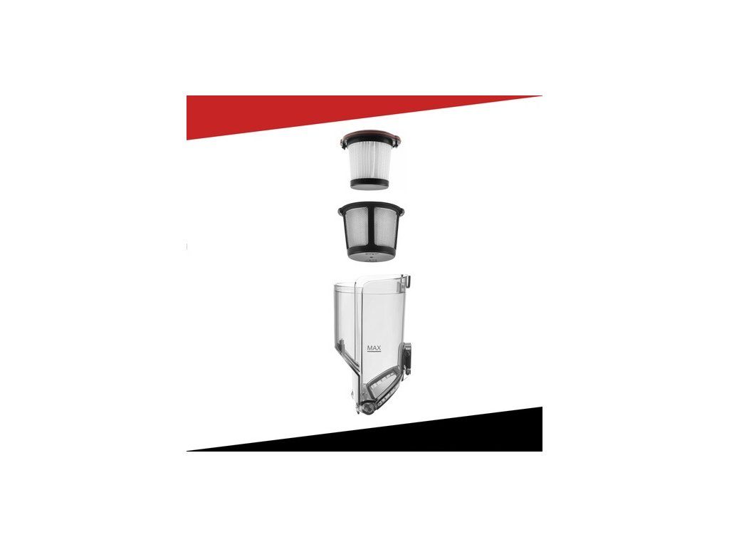 Curățarea recipientului este ușoară. Apăsați butonul aspiratorului pentru a debloca filtrul. Scoateți filtrul, curățați-l, apoi introduceți-l la loc și închideți recipientul.