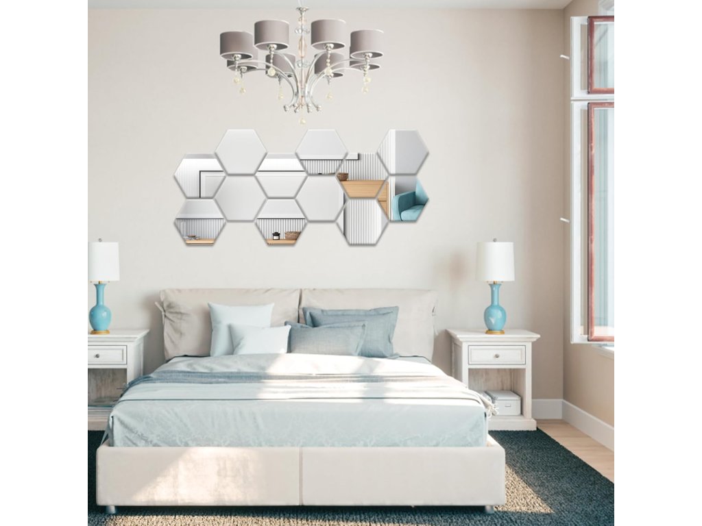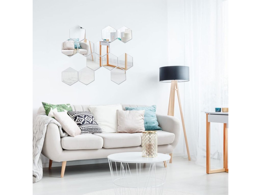 Setul de douăsprezece hexagoane oferă posibilități nelimitate de aranjare. De la modele geometrice precise la mozaicuri abstracte. Puteți plasa autocolantele oglindă pe un perete ca element dominant sau le puteți răspândi în mai multe locații din interior ca un accent subtil de design.
