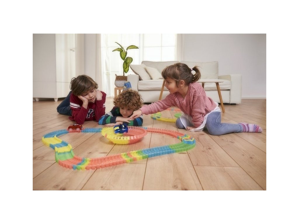 Pachetul include o mașină de jucărie specială. Introduceți 1 baterie AA. Apoi, tot ce trebuie să faci este să pornești mașina, să stai pe pistă și să te bucuri de plimbare rapidă cu toate capcanele pentru care te pregătești pentru ea. Nu există suficiente posibilități nesfârșite în construcția de piste și doriți să experimentați ceva unic? Stinge luminile și lasă autostrada să se lumineze în jurul camerei, datorită materialului fluorescent din care este făcută. Jocul de culori este completat de mașina, care este echipată cu iluminare LED proprie. Îl pornești cu butonul și te bucuri de o plimbare frumoasă și rapidă. Datorită autocolantelor incluse, îl puteți lipi.