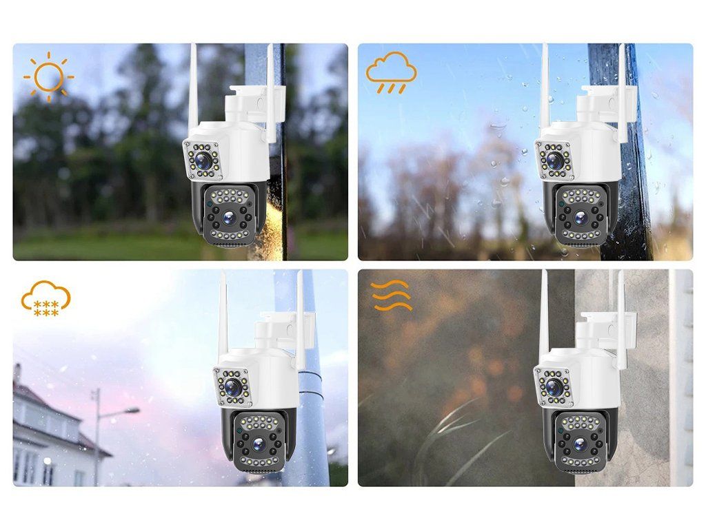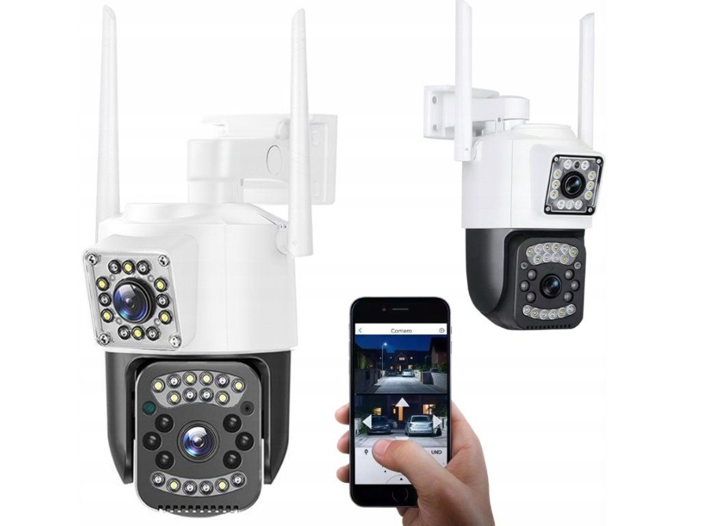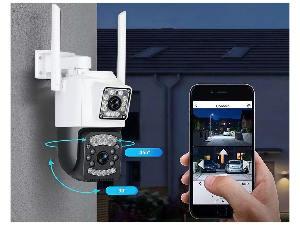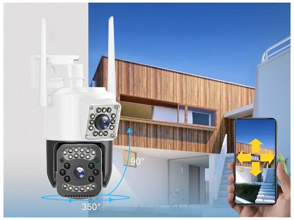 Camera WiFi duală pentru exterior are două lentile, una statică și cealaltă rotativă. Cea statică surprinde constant o parte a spațiului, în timp ce cea rotativă poate urmări mișcarea pe o rază de până la 355° pe orizontală și 90° pe verticală.