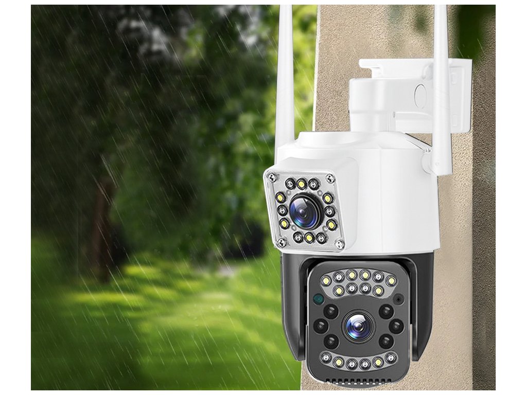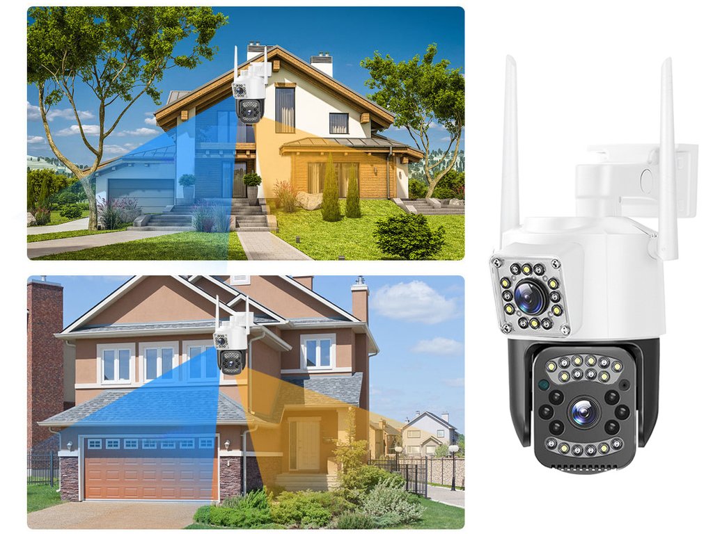 Camera WiFi duală pentru exterior are două lentile, una statică și cealaltă rotativă . Cea statică surprinde constant o parte a spațiului, în timp ce cea rotativă poate urmări mișcarea pe o rază de până la 355° pe orizontală și 90° pe verticală .