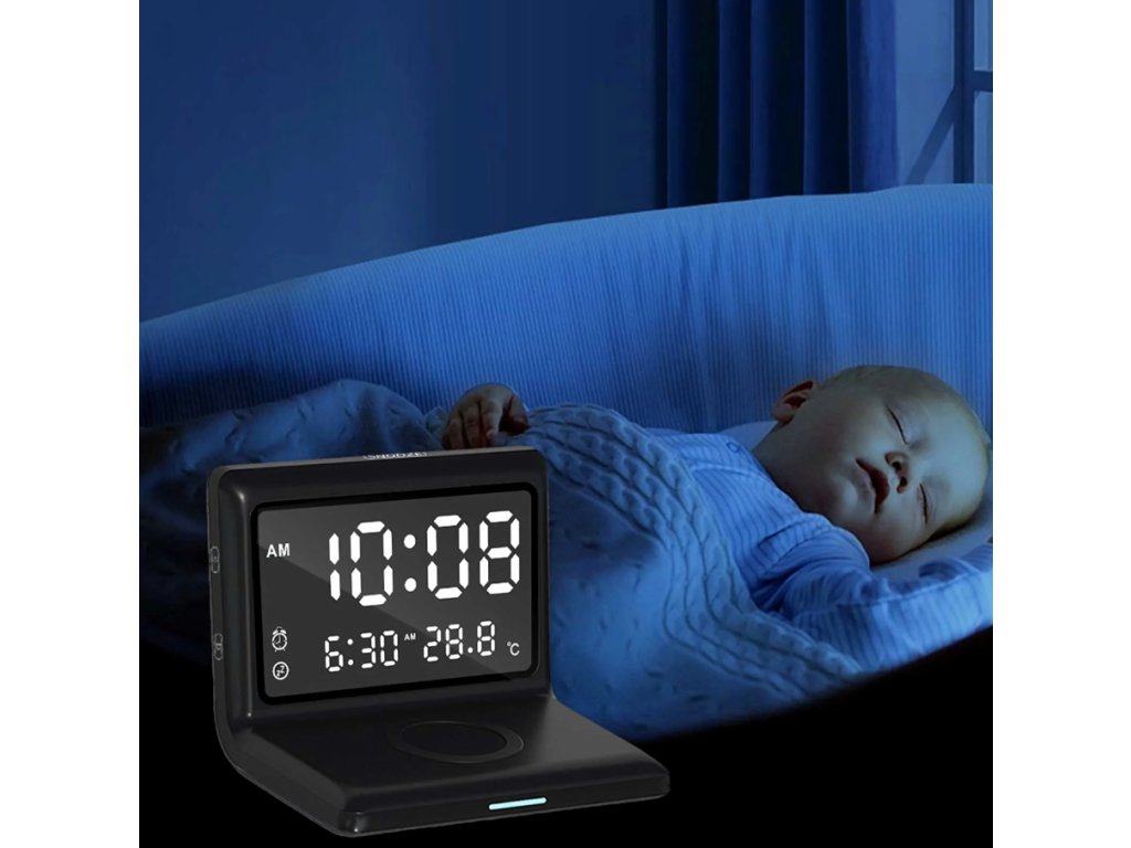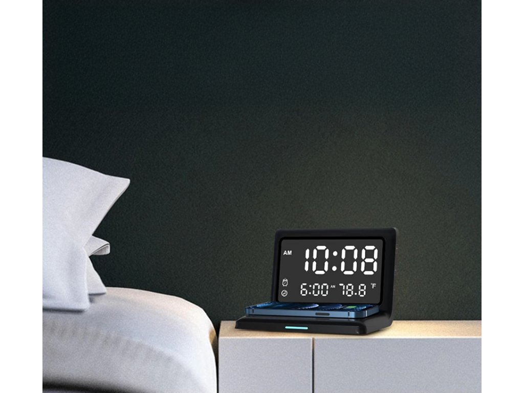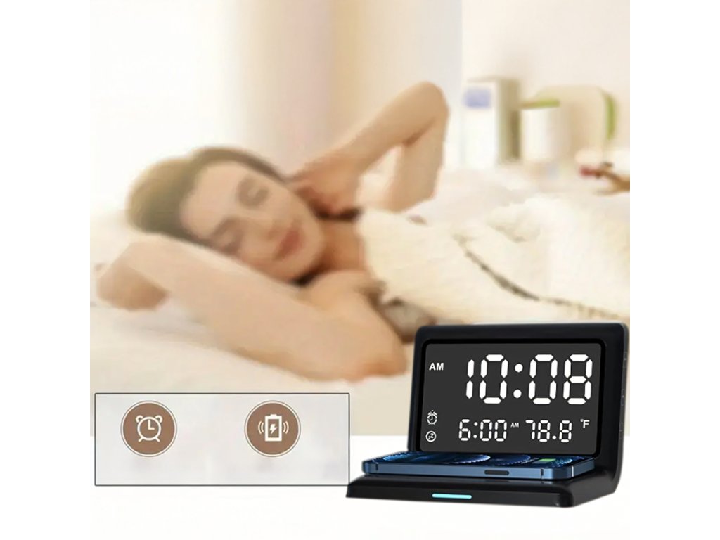 Excelentul ceas deșteptător inteligent digital 3 în 1 îndeplinește trei sarcini simultan, astfel încât tot ce este important să fie mereu la îndemână. Primești ora exactă, o imagine de ansamblu instantanee a temperaturii și opțiunea de încărcare wireless rapidă , care te va elibera de dezordinea de pe birou. Este o soluție care economisește spațiu și crește confortul vieții tale de zi cu zi.