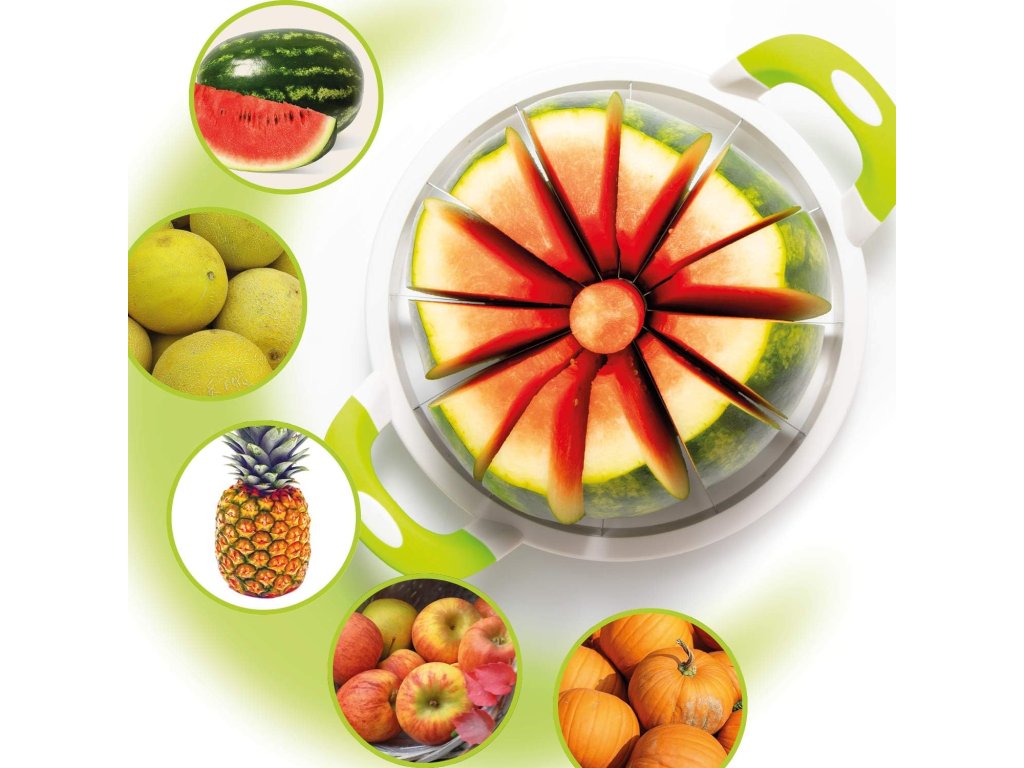 Cu acest feliator practic de pepene verde puteți prepara bucăți de fructe proaspete în câteva secunde. Pe lângă pepene verde, este potrivit și pentru ananas, mere mari sau alte fructe mari. Ideal pentru sărbători în familie, grătare sau picnicuri de vară, unde vă puteți bucura de o experiență gourmet.