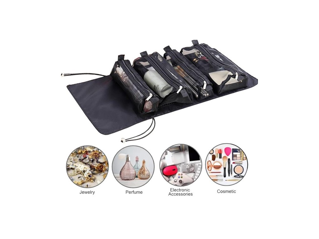 Deși geanta pliabilă pentru cosmetice este spațioasă atunci când este desfăcută, se transformă într- un pachet compact atunci când este rulată, ceea ce poate economisi mult spațiu în bagaj. O altă caracteristică neprețuită este închiderea care menține în mod fiabil geanta în stare rulată.