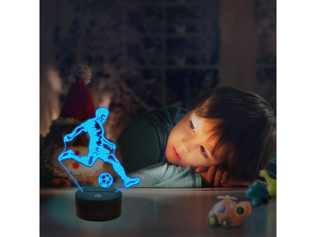 Cauți un plus elegant pentru camera micului tău fan al fotbalului? Această lumină de noapte 3D cu un jucător de fotbal este o modalitate sigură de a face senzație. Mai ales dacă își poate alege culoarea și modul preferat.