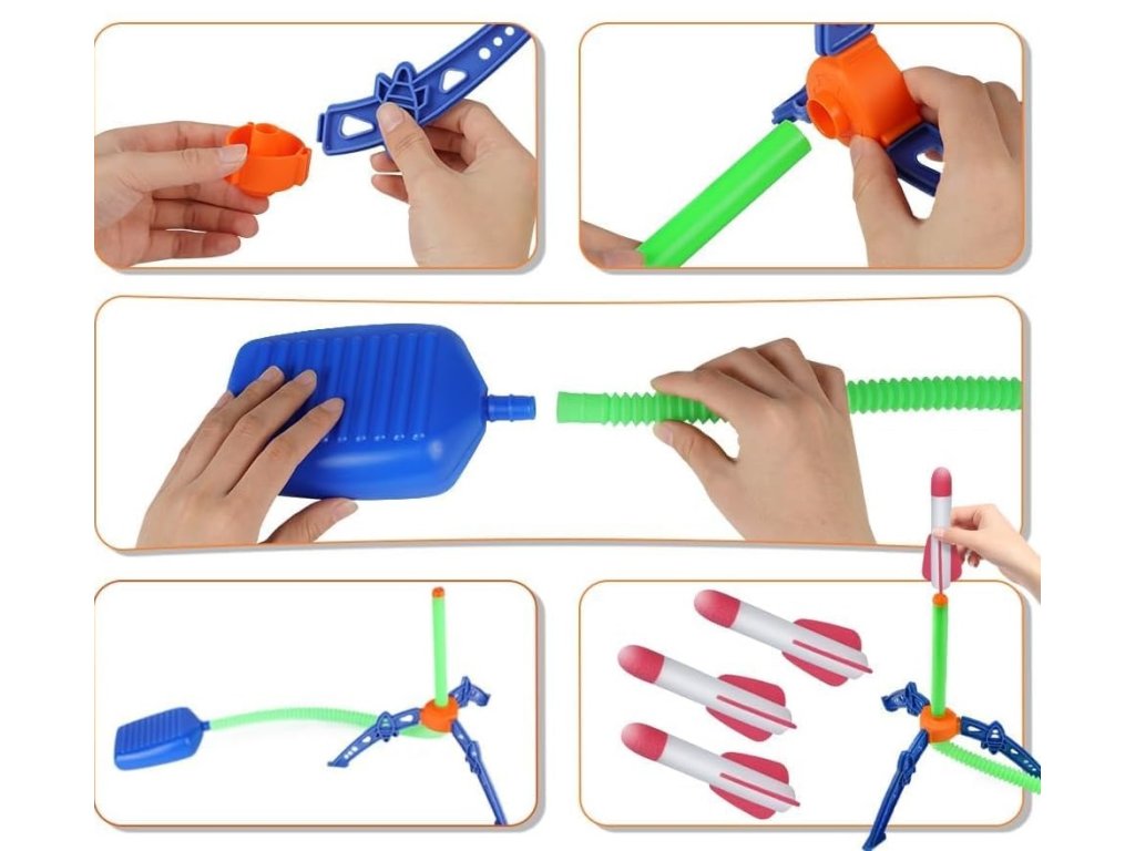 - Pachetul include: 1 × pompă de aer, 1 × furtun, 4 × suporturi - picioare, 1 × lansator de rachete, 3 × rachete din spumă