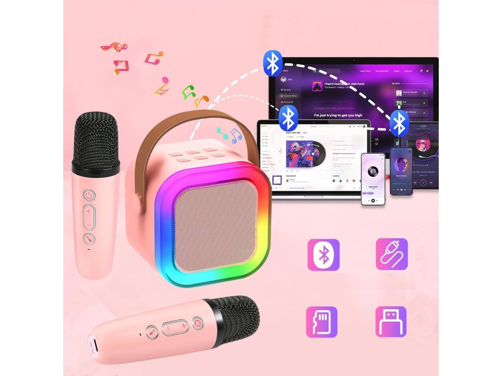 O reprezentație perfectă include cu siguranță un spectacol de lumini. Setul profesional de karaoke cu microfon oferă până la 5 moduri de iluminare RGB dinamice, care creează o scenă plină de culori. Copiii se vor simți ca niște vedete atunci când melodiile lor preferate sunt completate de efecte de lumină colorate.