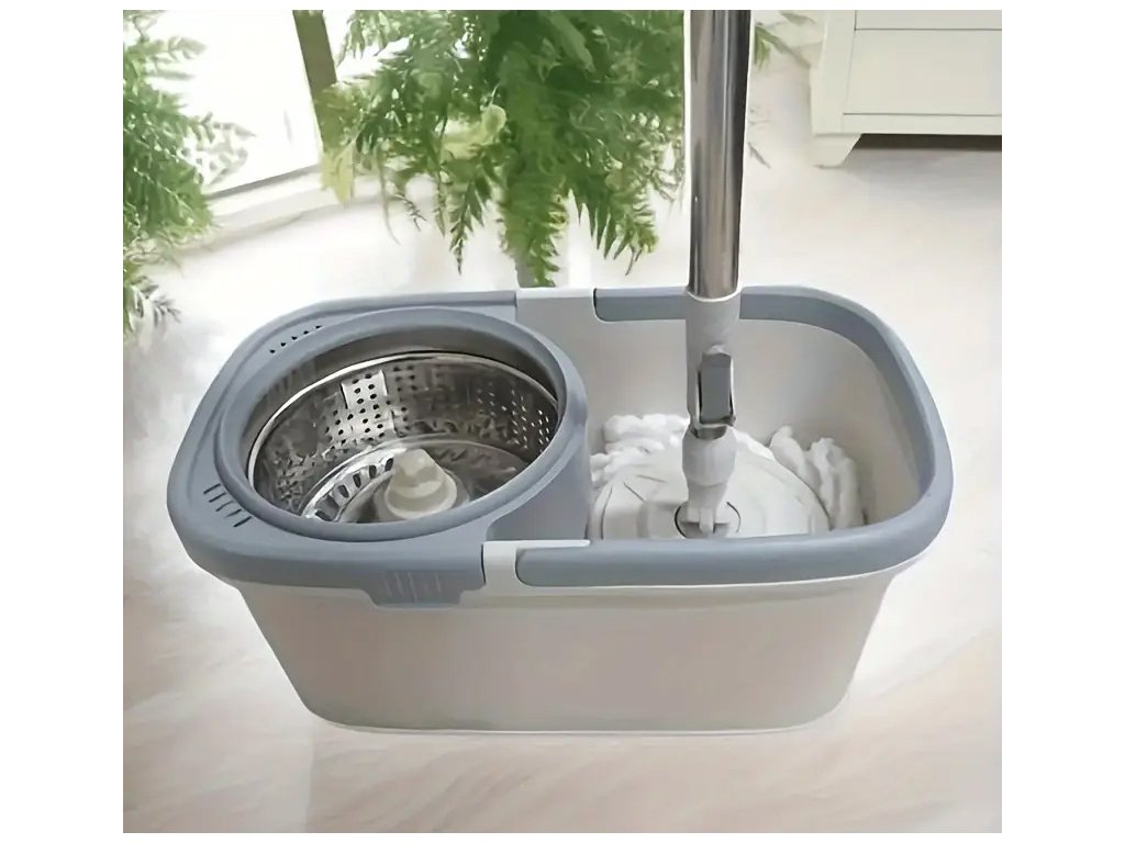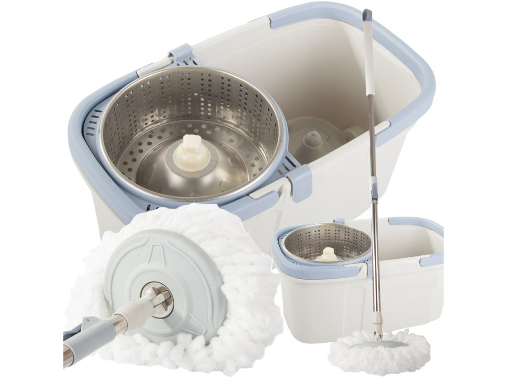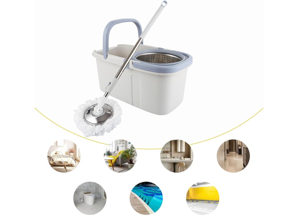 Acest mop rotativ practic cu găleată este ideal atât pentru curățarea uscată, cât și umedă a tuturor suprafețelor din casă. Îndepărtează praful, firimiturile și murdăria uscată fără a deteriora podeaua. Husa din microfibră are proprietăți excelente de absorbție și este ușor de curățat.