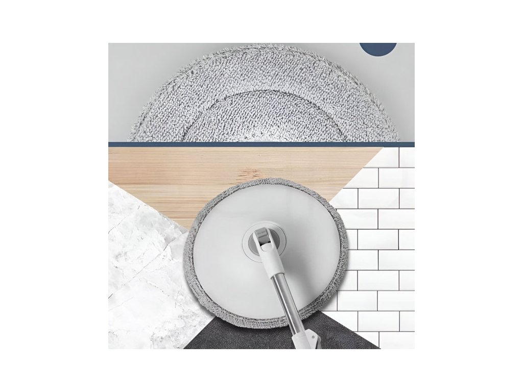 Acest mop rotativ practic cu găleată este ideal atât pentru curățarea uscată, cât și umedă a tuturor suprafețelor din casă. Îndepărtează praful, firimiturile și murdăria uscată fără a deteriora podeaua. Husa din microfibră are proprietăți excelente de absorbție și este ușor de curățat.