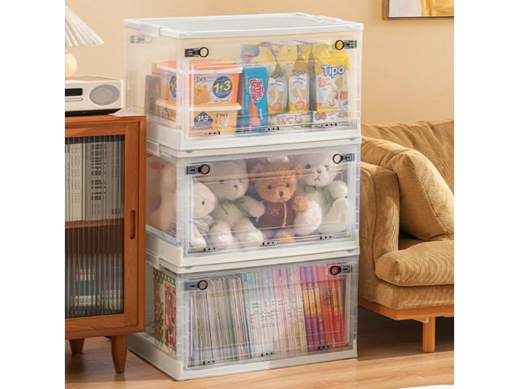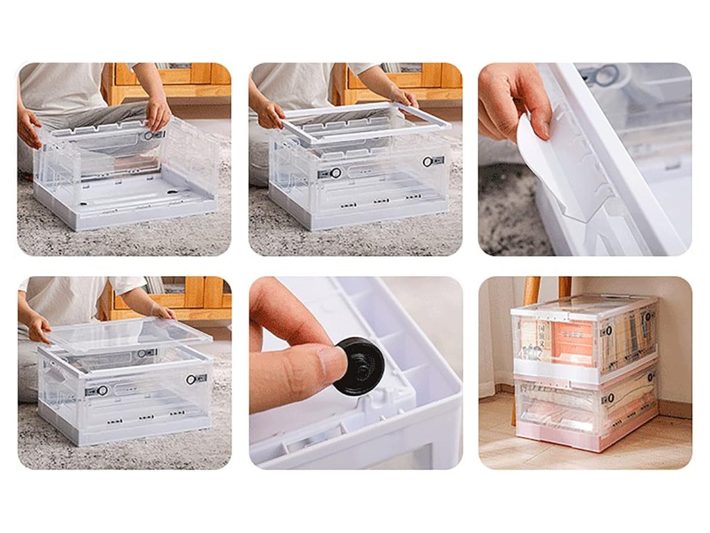Asamblarea organizatorului pliabil este rapidă și ușoară. Pur și simplu îndoiți pereții, fixați-i în ramă și închideți capacul transparent. În câteva secunde aveți gata o cutie de depozitare funcțională pe care o puteți utiliza imediat. Sistemul de pliere este intuitiv și poate fi manevrat de oricine.