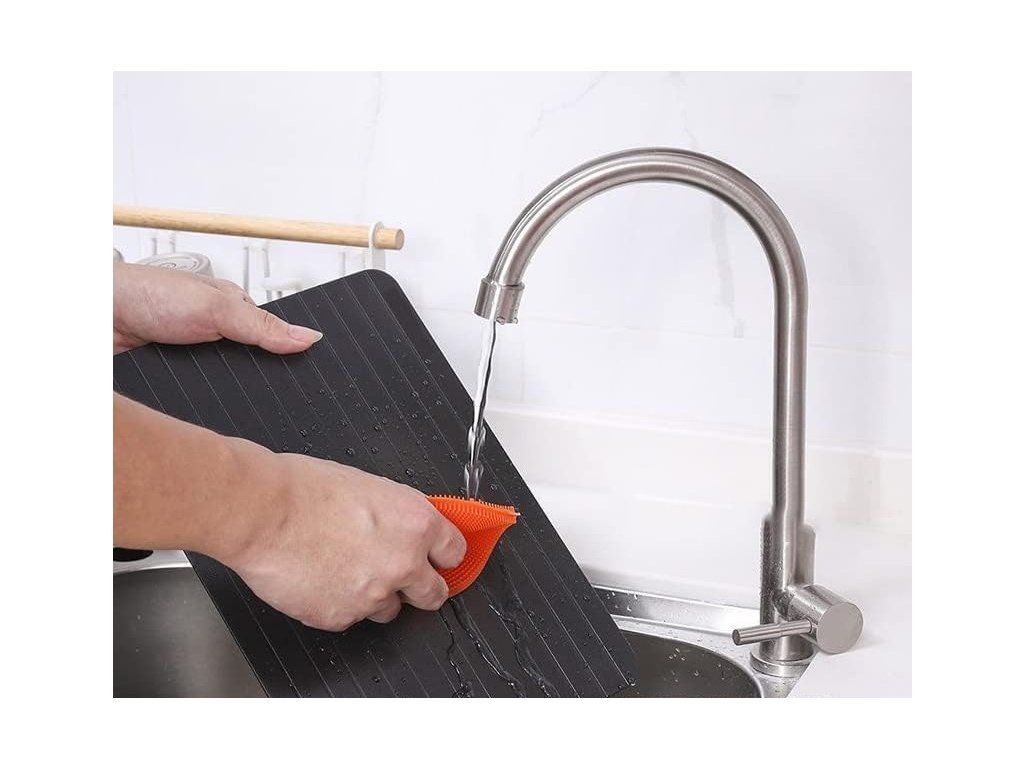 Placa de decongelare are o suprafață unică, care nu absoarbe mirosuri sau lichide. De asemenea, este foarte ușor de curățat. Așadar, clătiți placa cu apă curată sau spălați-o cu un detergent blând și va fi gata de utilizare din nou.