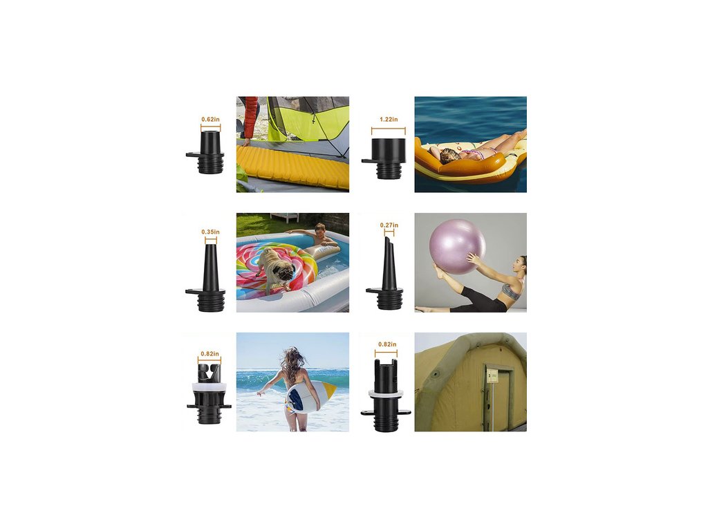Pompa electrică este potrivită nu doar pentru plăcile de SUP, ci și pentru majoritatea dispozitivelor gonflabile. Pachetul include până la 6 accesorii diferite care vă pot ajuta să umflați o saltea, o minge de fitness, o piscină, dispozitive gonflabile și multe altele.