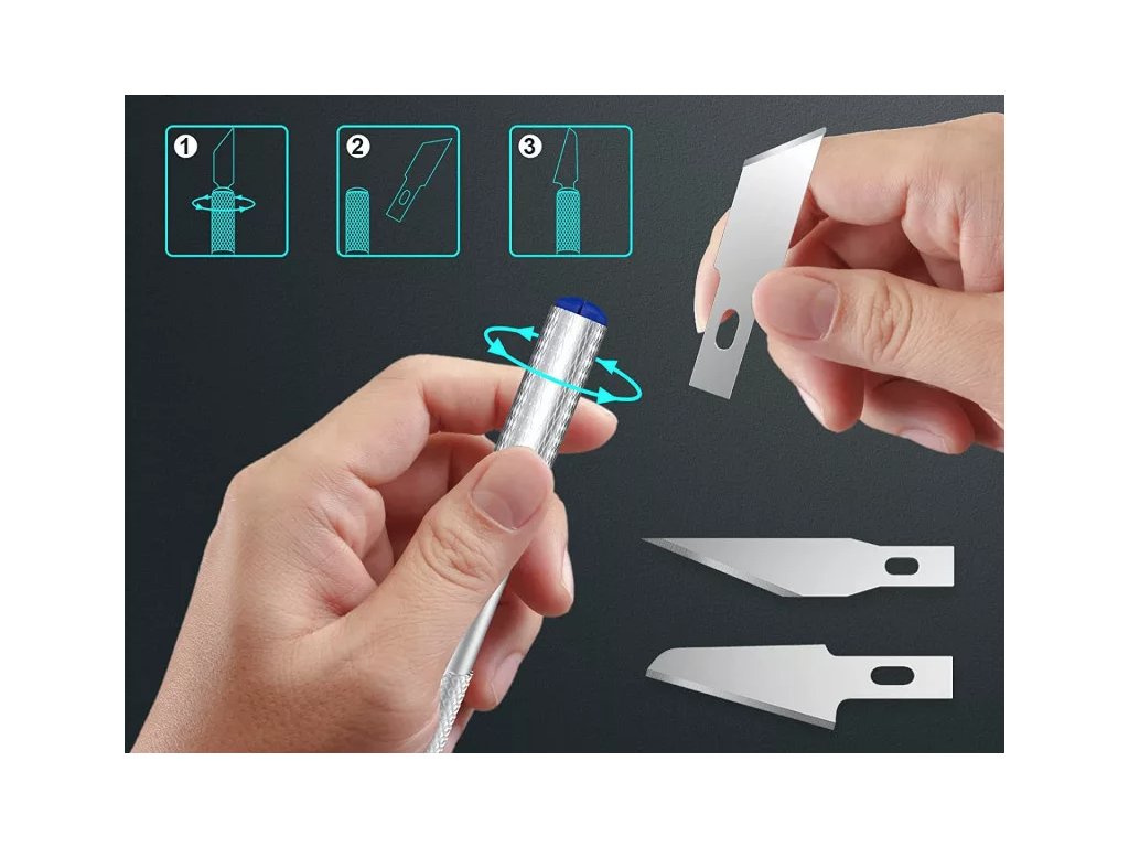 Cuțitele de modelat sunt proiectate și construite pentru a face schimbarea lamelor cât mai ușoară posibil. Indiferent dacă schimbi o lamă tocită cu una ascuțită sau pur și simplu ai nevoie de un alt tip de lamă, este o mișcare rapidă . Ai grijă însă, pentru că sunt foarte ascuțite.