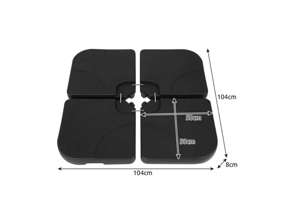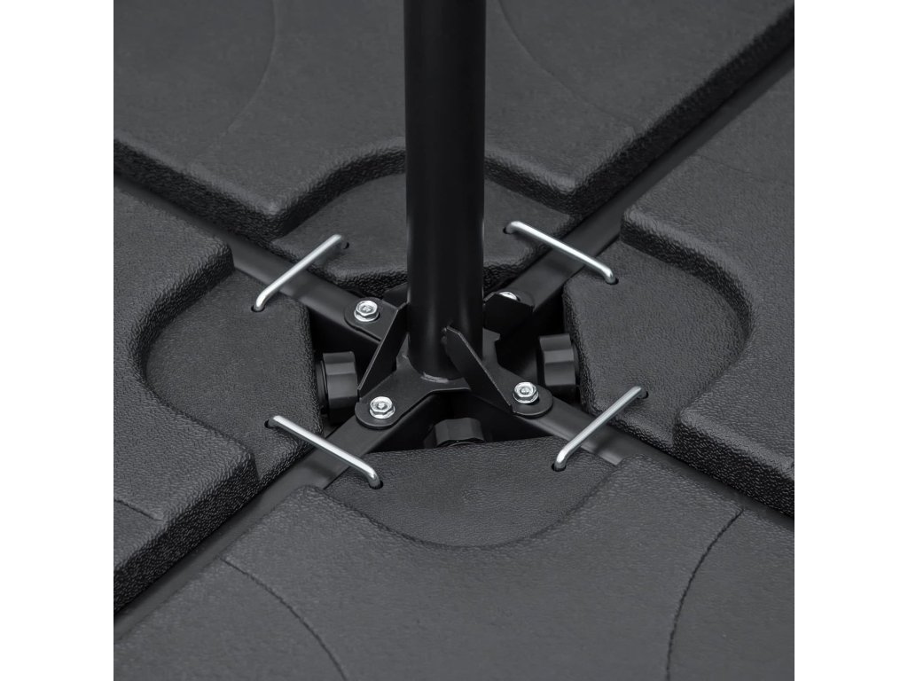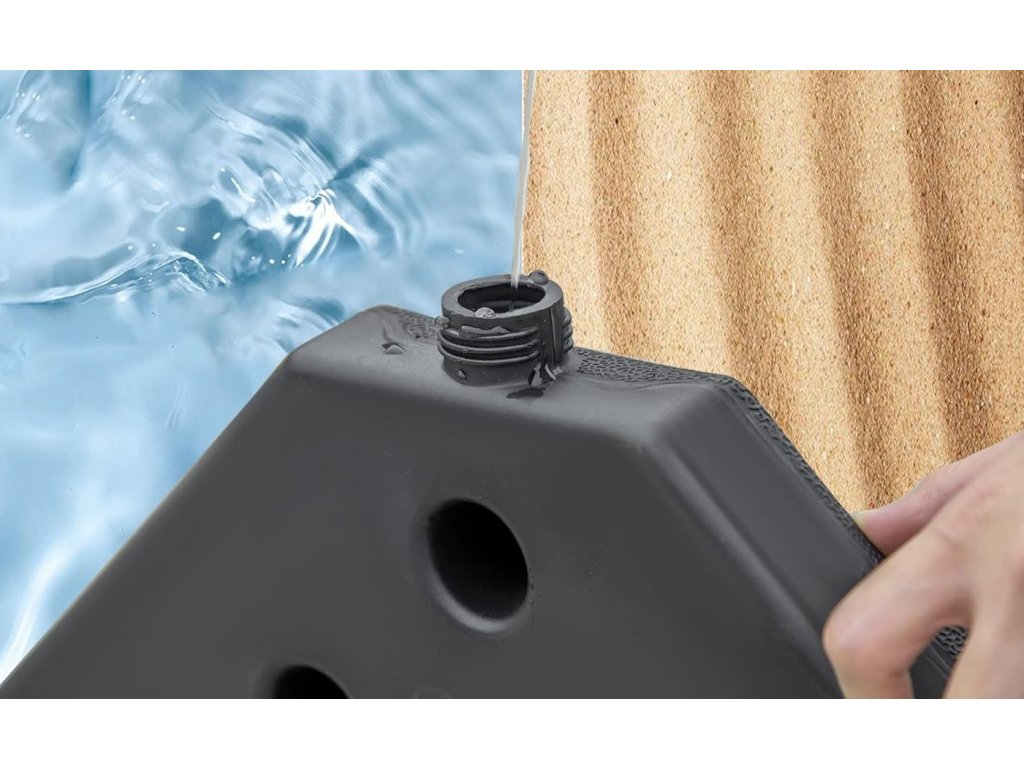 Descoperă secretul eficienței. Baza parasolarului este alcătuită din 4 părți care pot fi umplute cu apă sau nisip. În acest fel puteți obține o greutate mai mare și, prin urmare, o stabilitate mai mare.