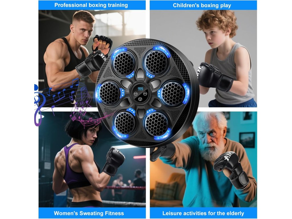 Înviorați-vă antrenamentul cu muzica preferată. Ținta electronică de box poate reda melodii prin Bluetooth, ceea ce vă poate ajuta să veniți cu alte idei. Pe lângă muzică, vă veți bucura și de iluminarea de fundal cu LED, care va oferi întregului antrenament o atmosferă complet nouă.